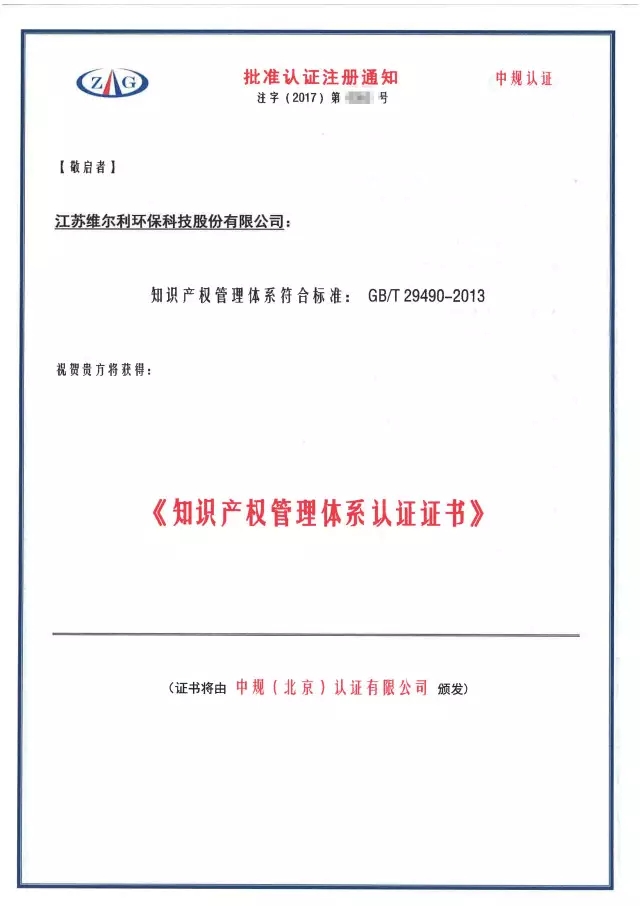 2017年6月,江蘇維爾利環(huán)保科技股份有限公司順利通過(guò)認(rèn)證,獲得GB/T29490-2013知識(shí)產(chǎn)權(quán)管理體系認(rèn)證證書(shū)。