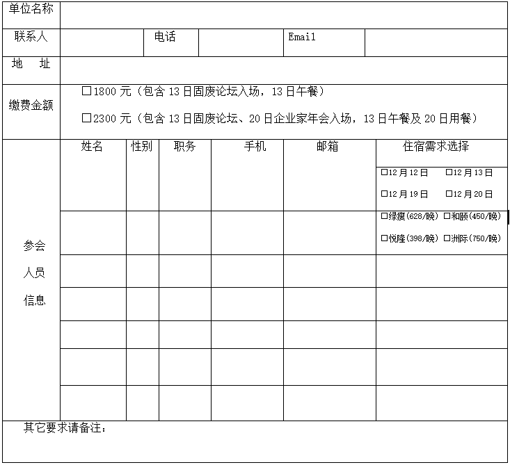 參會(huì)代表交通及住宿費(fèi)用自理。請(qǐng)將注冊(cè)費(fèi)匯款到指定賬戶并于2019年12月11日前并發(fā)參會(huì)回執(zhí)(附件2)至?xí)?wù)組郵箱:zghl@envirunion.com。