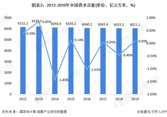 我國(guó)供水總量在2013年達(dá)到峰值后開始緩慢下降,近幾年,全國(guó)供水總量保持基本穩(wěn)定,平均年變化幅度保持在±1%左右。2019年我國(guó)供水總量為6021.2億立方米,同比增加0.09%,我國(guó)供水市場(chǎng)已趨近飽和,進(jìn)入平穩(wěn)發(fā)展?fàn)顟B(tài)。