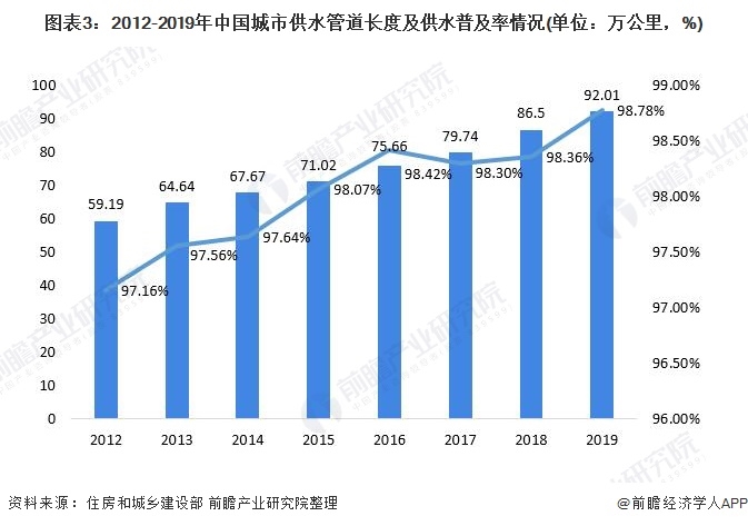 我國(guó)供水市場(chǎng)進(jìn)入平穩(wěn)發(fā)展?fàn)顟B(tài)得益于近年來(lái)我國(guó)供水管道長(zhǎng)度及供水普及率的逐年增長(zhǎng)。2019年我國(guó)城市供水管道長(zhǎng)度達(dá)92.01萬(wàn)公里,供水普及率達(dá)98.78%。