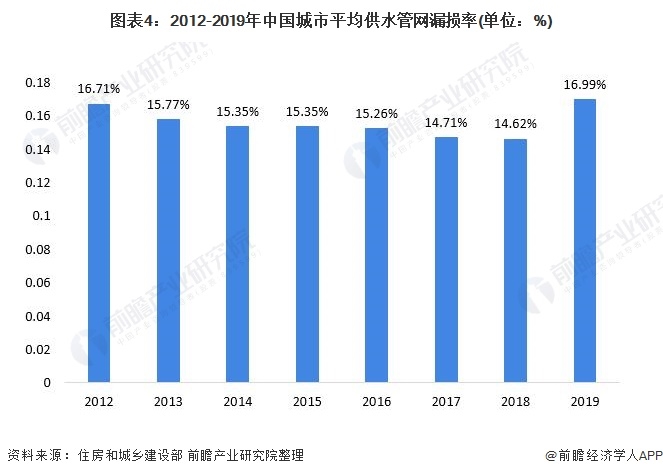 隨著我國(guó)供水管道長(zhǎng)度的增長(zhǎng),我國(guó)供水管網(wǎng)漏損率也有所下降。2012-2018年,我國(guó)城市供水管網(wǎng)漏損率從16.71%下降至14.62%。2019年,我國(guó)供水管網(wǎng)漏損率小幅上升,增至16.99%。