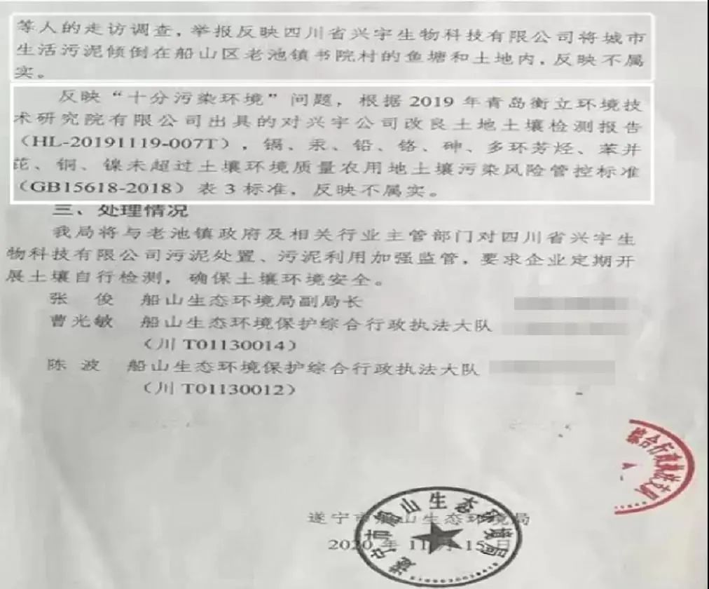 特別是2020年11月,四川省省級(jí)生態(tài)環(huán)保督察進(jìn)駐遂寧市期間,群眾再次投訴該公司非法傾倒填埋污泥問(wèn)題,但是船山區(qū)卻回復(fù)謊稱(chēng)群眾反映問(wèn)題不屬實(shí)。遂寧市也未經(jīng)認(rèn)真核實(shí)就原樣轉(zhuǎn)報(bào)調(diào)查結(jié)論,導(dǎo)致問(wèn)題依然未能得到及時(shí)解決。