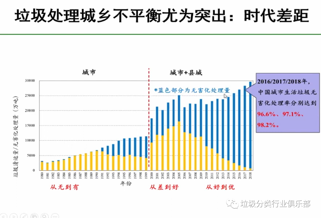 當(dāng)前城市的垃圾處理基本問(wèn)題已解決,現(xiàn)在要在分類(lèi)的新的理念引領(lǐng)下,我們向著可以構(gòu)建新型模式,但是我們大的無(wú)害化處理這些問(wèn)題已基本得到解決。2018年垃圾的垃圾無(wú)害化處理已經(jīng)達(dá)到了98.2%,而農(nóng)村連基本數(shù)據(jù)都沒(méi)有,農(nóng)村的數(shù)據(jù)很多都是估計(jì)的?,F(xiàn)代化的管理是數(shù)字化的管理、信息化的管理,沒(méi)有數(shù)字就表明對(duì)它是沒(méi)有管理。底數(shù)不清,說(shuō)明對(duì)它的管理薄弱。