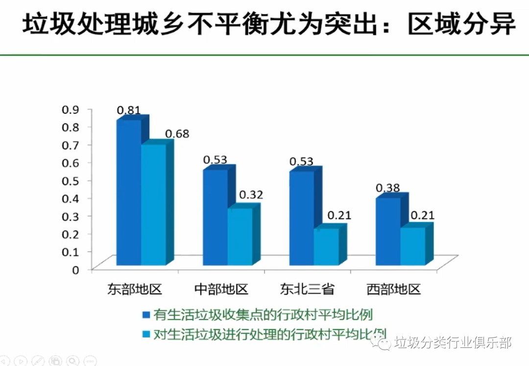 垃圾處理方面,區(qū)域差異性比較大。經(jīng)濟(jì)比較發(fā)達(dá)的東部地區(qū)、其次是中部略微要好些。東部很多地方都已經(jīng)通過(guò)城鄉(xiāng)一體化的管理以及垃圾的處理,基本上有了一些保障,但是東北、西部依然看到有生活垃圾收集點(diǎn)的行政村比例都很低,處理的就更低了。