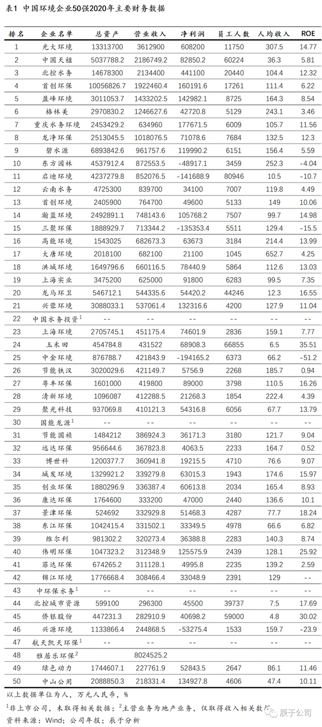 2021年7月全國工商聯(lián)環(huán)境商會發(fā)布了最新一期的中國環(huán)境企業(yè)50強(qiáng)榜單,辰于對榜單中企業(yè)的主要財務(wù)數(shù)據(jù)(見表 1)進(jìn)行統(tǒng)計發(fā)現(xiàn),光大環(huán)境高居榜首收入達(dá)到361億元,超過第二名65%;企業(yè)需要收入超過21億元才能進(jìn)入50強(qiáng),超過87億元才能進(jìn)入前10強(qiáng);由于主營業(yè)務(wù)差異,各企業(yè)在人均收入、ROE等指標(biāo)上也有較大差距,環(huán)衛(wèi)行業(yè)的企業(yè)人均收入都比較低,其他領(lǐng)域的人均收入平均150萬元左右。