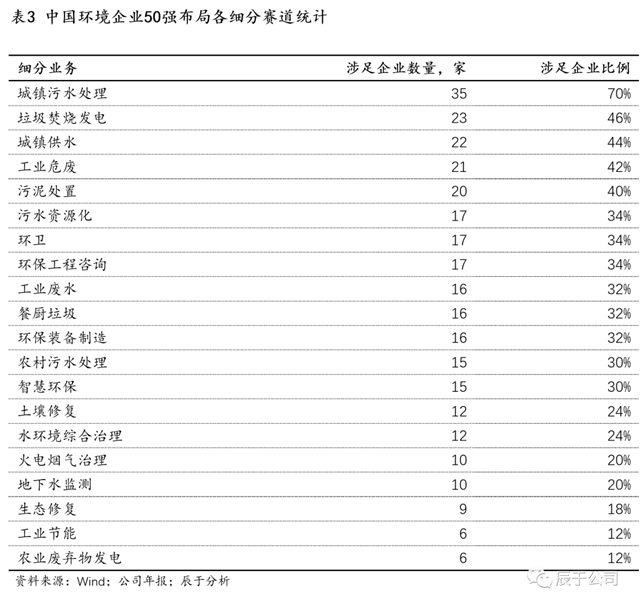 更細(xì)分去看,城鎮(zhèn)污水處理、垃圾焚燒發(fā)電、城鎮(zhèn)供水、工業(yè)危廢等是中國環(huán)境企業(yè)50強(qiáng)布局最多的細(xì)分領(lǐng)域(見表3),這些領(lǐng)域基本都是規(guī)模上千億甚至數(shù)千億的市場,“盤子”足夠大,商業(yè)模式穩(wěn)定,是環(huán)境強(qiáng)企必爭之地。