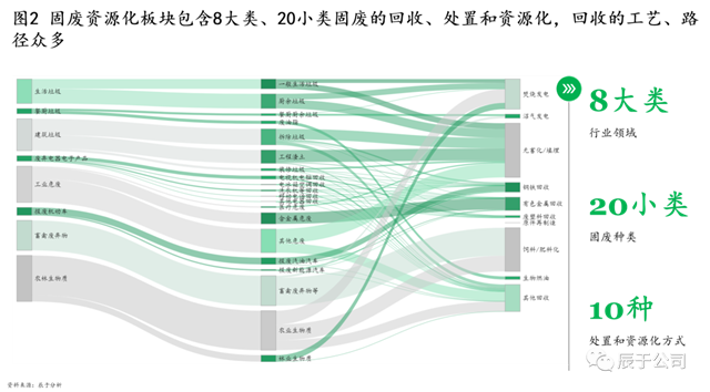 固廢資源化板塊包含8大類、20小類固廢的回收、處置和資源化,回收的工藝、路徑眾多(見圖2),除此之外還包含環(huán)衛(wèi)等服務(wù)領(lǐng)域,最大的特點就是規(guī)模大——當(dāng)前的總市場規(guī)模超過2萬億,足夠容納20個千億級環(huán)保企業(yè),而且“十四五”期間預(yù)計還將保持8%~10%的年復(fù)合增長率。