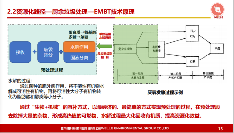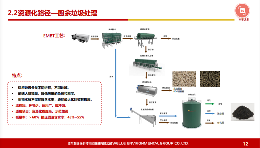 對(duì)于有機(jī)廢棄物的原料及核心技術(shù),可以說(shuō)從城市有機(jī)廢棄物到農(nóng)村有機(jī)廢棄物,現(xiàn)在最核心的還是通過(guò)厭氧發(fā)酵技術(shù),最終通過(guò)沼氣化利用,達(dá)到無(wú)害化或者是環(huán)?;俦M可能實(shí)現(xiàn)資源化。國(guó)家發(fā)改委推出了一百個(gè)餐廚垃圾處理試點(diǎn)項(xiàng)目,之后進(jìn)行全方位地推出。在國(guó)內(nèi)真正運(yùn)行好的餐廚垃圾項(xiàng)目并不是特別多,主要工藝還是以厭氧為主。為什么這塊資源化的效率會(huì)好一些?尤其在“碳減排”的壓力下,使得出口價(jià)格一直比較好,這個(gè)行業(yè)最近稍微能夠掙點(diǎn)錢(qián)。另外,更深度的資源化利用,比如做有機(jī)質(zhì),食用的昆蟲(chóng)養(yǎng)殖,也會(huì)有一些收益,再加上沼氣的收益。對(duì)于餐廚垃圾處理,我認(rèn)為如果到了一定規(guī)模,收益還是不錯(cuò)的。相對(duì)來(lái)說(shuō),廚余垃圾的資源化利用效率會(huì)差一些。現(xiàn)在全國(guó)都在推行垃圾分類(lèi),不同城市廚余垃圾的質(zhì)量相差比較大。如上海的廚余垃圾含水率、油脂含量與餐廚垃圾是有一點(diǎn)類(lèi)似的,含油量可能稍微小一點(diǎn),但在其他城市就相差非常大。廚余垃圾資源化是節(jié)省能源化的利用,以無(wú)害化為主,有一些也可以做食用昆蟲(chóng)的養(yǎng)殖。 對(duì)于濕垃圾或者是廚余垃圾,我們特別推出一款技術(shù)——EMBT技術(shù)。結(jié)合生物水解技術(shù),原理是有機(jī)廢棄物或者有機(jī)物在厭氧發(fā)酵過(guò)程當(dāng)中主要是通過(guò)酸化水解以及產(chǎn)甲烷兩個(gè)階段,我們通過(guò)設(shè)施化的反應(yīng)器,把酸化水解在前面就能夠作為預(yù)處理,真正地溶解到水下面的有機(jī)物再到厭氧處理,這樣使得厭氧反應(yīng)器不要那么復(fù)雜,剩下的固渣資源化也會(huì)比較方便,去做水量化的利用都是可行的。這個(gè)工藝現(xiàn)在在上海包括在紹興做下來(lái),還是受到比較多的認(rèn)可。