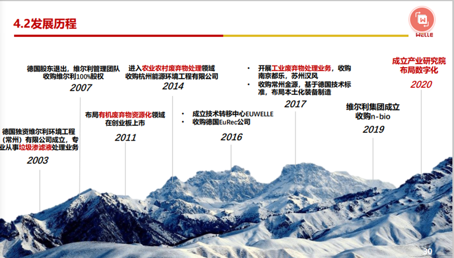 最后,簡(jiǎn)單講一講維爾利的概況與發(fā)展歷程。維爾利集團(tuán)(原江蘇維爾利環(huán)??萍脊煞萦邢薰荆?,2003年成立,2011年創(chuàng)業(yè)板上市,目前全球有六十多家分子公司及項(xiàng)目公司,板塊也是比較多元。發(fā)展也是源自于德國(guó),維爾利曾經(jīng)是德國(guó)的全資子公司,到后來(lái)發(fā)展成國(guó)內(nèi)的一家上市公司。從技術(shù)這塊,我們也是相對(duì)比較創(chuàng)新。在裝備這塊,維爾利并購(gòu)了德國(guó)的一些裝備制造企業(yè)。希望中國(guó)的裝備制造企業(yè)能夠加快裝備的國(guó)產(chǎn)化,是對(duì)于整個(gè)的裝備提升還是有好處的。我們同時(shí)組建了很多小型技術(shù)公司,提升海外項(xiàng)目執(zhí)行的能力,整體發(fā)展的路徑還是非常清晰的。集團(tuán)將核心業(yè)務(wù)定位在城鄉(xiāng)一體化有機(jī)廢棄物資源化。最后,借用凱軍老師的話,"沼氣元年"已經(jīng)開(kāi)啟,我們能夠借助于碳達(dá)峰、碳減排機(jī)會(huì),讓沼氣行業(yè)迎來(lái)新發(fā)展!愿與在座各位沼氣同仁一起合作、共生、共贏。來(lái)源 | 中國(guó)沼氣學(xué)會(huì)
