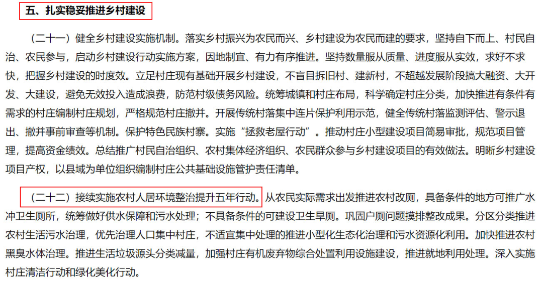 今年的中央一號(hào)文件,已經(jīng)是21世紀(jì)以來第19個(gè)指導(dǎo)“三農(nóng)”工作的中央一號(hào)文件。中央一號(hào)文件中,對(duì)2022年的“三農(nóng)”工作做出了全面部署,其中包括糧食生產(chǎn)、現(xiàn)代農(nóng)業(yè)、防止規(guī)模性返貧、鄉(xiāng)村產(chǎn)業(yè)、鄉(xiāng)村建設(shè)、鄉(xiāng)村治理、保障機(jī)制,以及黨的領(lǐng)導(dǎo)等8個(gè)章節(jié)。這里面,與環(huán)保產(chǎn)業(yè)關(guān)系最密切的就是第5章“扎實(shí)穩(wěn)妥推進(jìn)鄉(xiāng)村建設(shè)”的第二十二節(jié)“接續(xù)實(shí)施農(nóng)村人居環(huán)境整治提升五年行動(dòng)”。 ·從農(nóng)民實(shí)際需求出發(fā)推進(jìn)農(nóng)村改廁,具備條件的地方可推廣水沖衛(wèi)生廁所,統(tǒng)籌做好供水保障和污水處理;不具備條件的可建設(shè)衛(wèi)生旱廁。