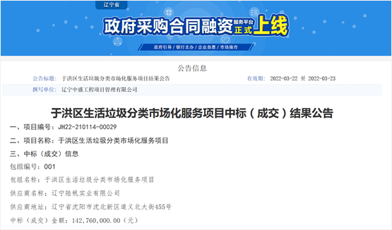 遼寧省政府采購網(wǎng)消息,2022年3月22日,沈陽市于洪區(qū)生活垃圾分類市場化服務(wù)項目公布開標結(jié)果,成交價1.4276億元。