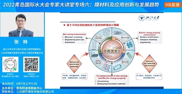 目前,無論是從鹵水提鋰、工業(yè)廢水分鹽資源化處理,還是從濃海水利用、飲用水鈣鎂選擇性去除等各方面來看,單/多價(jià)離子鹽分離需求的上漲都是可見的。“納濾是最具潛力的單多價(jià)陽離子分離技術(shù)之一”,張林副院長對基于不同分離機(jī)理的離子選擇性NF膜設(shè)計(jì)路徑進(jìn)行了分析,還介紹了新型膜材料。