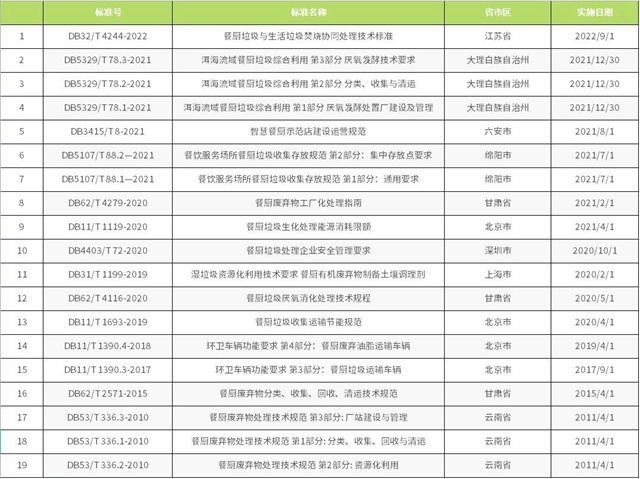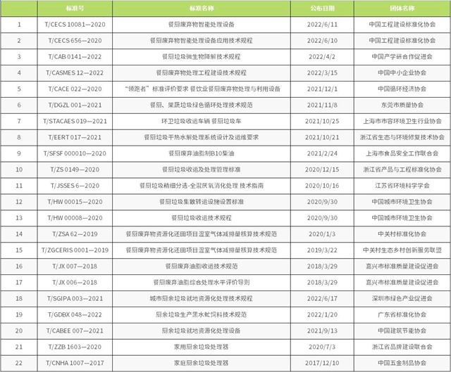 截至目前,已備案的餐廚垃圾相關標準有《餐廚垃圾車》QC/T 935-2013、《餐廚棄物處理機》JB/T 12342-2015、《餐廚廢棄物油水自動分離設備》CJ/T 478-2015、《餐廚垃圾自動分選系統(tǒng) 技術條件》JB/T 13166-2017、《餐廚廢棄物生產(chǎn)肥料中生物腐植酸含量測定方法》HG/T 5603-2019和《土壤調(diào)理劑及使用規(guī)程 餐廚廢物原料》NY/T 3935-2021。