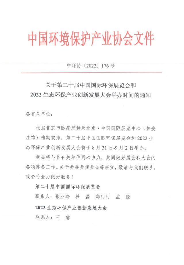 關(guān)于第二十屆中國國際環(huán)保展覽會和2022生態(tài)環(huán)保產(chǎn)業(yè)創(chuàng)新發(fā)展大會舉辦時間的通知