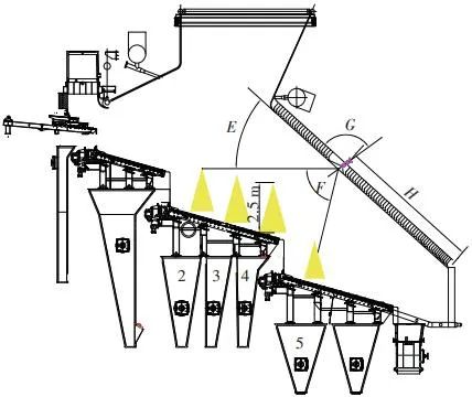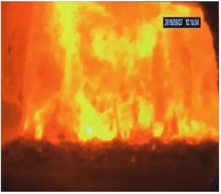 當(dāng)前生活垃圾焚燒爐廣泛采用的爐膛火焰監(jiān)視系統(tǒng)基本上都是由早期應(yīng)用在水泥廠、鋼鐵廠的加熱爐、退火爐和氧化鋁廠等行業(yè)內(nèi)的高溫看火工業(yè)電視演變升級而來。內(nèi)窺式數(shù)字高清爐膛火焰監(jiān)視系統(tǒng)成像裝置主要由耐高溫針孔電動(dòng)鏡頭、寶石物鏡、光學(xué)濾光片、光圈焦距調(diào)節(jié)器等組成,配有電控推進(jìn)器、氣源控制柜、光端機(jī)等輔助設(shè)備。其核心問題是如何在生活垃圾焚燒爐的高溫、多塵、強(qiáng)腐蝕環(huán)境中長周期穩(wěn)定運(yùn)行,保證火焰畫面不丟包、不失真。1)優(yōu)勢特性分析。一是技術(shù)成熟、運(yùn)行穩(wěn)定。隨著我國近一二十年間生活垃圾發(fā)電廠的興建,爐膛火焰監(jiān)視系統(tǒng)的技術(shù)也處于不停地優(yōu)化和迭代之中,目前已能滿足穩(wěn)定、可靠的要求。其中常規(guī)配置參數(shù)為攝像頭300 萬像素,響應(yīng)時(shí)間2 s,光圈(F數(shù))1.6,焦距2.4 mm。二是工作環(huán)境好。爐膛火焰監(jiān)視器探頭通常安裝于焚燒爐后墻,所處位置是垃圾燃燒最末端,常規(guī)工況下探頭周圍煙氣溫度通常<600 ℃。較之焚燒爐其他高溫環(huán)境已算“宜居地帶”。三是維護(hù)量小。焚燒爐后墻幾乎沒有結(jié)焦現(xiàn)象,常規(guī)爐膛火焰監(jiān)視探頭開孔位置僅存有因爐膛偶爾正壓時(shí)煙氣外冒造成的積灰,積灰量不大,清理工作較為輕松。2)劣勢特性分析。一是參數(shù)單一。因垃圾焚燒行業(yè)爐型構(gòu)造和燃燒成分的特殊性,垃圾焚燒爐長期采用的火焰探頭利用的是光學(xué)成像原理,運(yùn)行人員僅能通過觀察火焰形狀和位置來判斷焚燒爐工況,無法得到多維度參數(shù)。二是視角局限。爐膛火焰探頭通常位于焚燒爐后墻,安裝角度朝向爐內(nèi)成斜向上方向,與水平線夾角15°左右,探頭視場角通常>60°。以某大型列動(dòng)順推爐排焚燒爐為例,在此仰視角度下可以看到爐排燃燒段尾部、燃燼段前部兩面明顯的火焰幕墻,由于火焰鋒面遮擋,很難觀察到燃燒段中前部的火焰狀況。 以某單臺(tái)750 t/d大型列動(dòng)順推爐排焚燒爐中爐膛火焰監(jiān)視器安裝位置和顯示畫面為實(shí)例,具體分析火焰成像狀態(tài)。其實(shí)際火焰成像畫面見圖1。成像角度是由焚燒爐后墻探頭位置向上仰視爐膛。因焚燒工況十分良好,靠近后墻的燃燼段區(qū)域幾乎沒有明火,燃燒段尾部成一面豎直、光亮的黃紅色火焰鋒面,高度約為2.5 m。對應(yīng)的爐膛火焰監(jiān)視器安裝示意如圖2所示。爐膛火焰探頭安裝在焚燒爐后墻,安裝位置與后墻觀火平臺(tái)地面距離為C(m)。開孔傾角與水平方向夾角為B(°),有效視場角為A(°)。圖2中由黃色填充的三角形區(qū)域代表正常燃燒火焰,其中標(biāo)注高度2.5 m的區(qū)域?yàn)槿紵隣t排尾部火焰,即為圖1所顯示的火焰鋒面。顯然,從爐膛火焰監(jiān)視器向上望去,燃燒段前部、中部火焰為視野盲區(qū)。由于被燃燒段尾部火焰鋒面遮擋,通過火焰監(jiān)視器通常只能看到燃燒段尾部、燃燼段前部這兩個(gè)區(qū)域的火焰。
