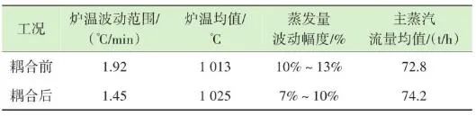 生活垃圾焚燒爐的排放物在滿足GB 18485—2014 生活垃圾焚燒污染控制標(biāo)準(zhǔn)的前提下,為保障焚燒爐的長期安全運(yùn)行、汽機(jī)系統(tǒng)的穩(wěn)定高效運(yùn)轉(zhuǎn),通常通過爐溫和主蒸汽流量這兩個(gè)因素來判斷鍋爐運(yùn)行是否良好。以下工況為某項(xiàng)目單臺(tái)750 t/d生活垃圾焚燒爐在紅外熱成像管理系統(tǒng)應(yīng)用前、應(yīng)用后兩段時(shí)期的實(shí)際運(yùn)行參數(shù),以此實(shí)例來解析該系統(tǒng)的運(yùn)行效果。該項(xiàng)目額定主蒸汽流量為74 t/h。如圖10所示,藍(lán)色實(shí)線為耦合前24 h變化率波動(dòng)范圍,紅色實(shí)線為耦合后24 h變化率波動(dòng)范圍。爐溫變化率指的是焚燒爐上、中、下3層共計(jì)9個(gè)溫度測點(diǎn)的熱電偶反饋溫度在每分鐘內(nèi)升高或降低的溫度值,而溫度變化率波動(dòng)范圍指的是單位時(shí)間內(nèi)溫度變化率最高值與最低值之間的溫度差,該差值越大表明爐溫波動(dòng)越大,即工況越不穩(wěn)定,波動(dòng)范圍越小表明工況越平穩(wěn)。此期間溫度也一直未低于環(huán)保部要求的最低限(850 ℃/2 s),均介于950~1 050 ℃。焚燒爐主蒸汽流量曲線如圖11所示,左側(cè)縱坐標(biāo)為主蒸汽流量,額定蒸發(fā)量74 t/h。圖中藍(lán)色實(shí)線為紅外熱成像系統(tǒng)與ACC系統(tǒng)耦合前24 h的主蒸汽流量曲線,紅色虛線為紅外熱成像系統(tǒng)與ACC系統(tǒng)耦合后24 h的主蒸汽流量曲線。表1中參數(shù)可以計(jì)算出耦合前后焚燒爐爐溫波動(dòng)范圍相對縮減了24.5%,焚燒爐爐溫均值提高了1.2%,蒸發(fā)量波動(dòng)幅度縮減了3個(gè)百分點(diǎn),主蒸汽流量提高了1.4 t/h。經(jīng)過對主要運(yùn)行參數(shù)的定量分析,可以看出結(jié)合了紅外熱成像系統(tǒng)的ACC系統(tǒng)在功能性和穩(wěn)定性上有顯著提升。表1 重要運(yùn)行參數(shù)統(tǒng)計(jì)基于目前紅外熱成像管理系統(tǒng)的功能,正在逐步進(jìn)行焚燒爐溫度場重構(gòu)工作,對于紅外探頭收集的大量溫度點(diǎn)實(shí)時(shí)數(shù)據(jù)進(jìn)行整合并進(jìn)行紅外溫度顯示。傳感器擁有1 440×1 080個(gè)像素,其中每個(gè)像素都有對應(yīng)的溫度值,該溫度值隨著目標(biāo)溫度的變化在800~1 600 ℃對應(yīng)變化,那么我們就可以將800~1 600 ℃這個(gè)范圍內(nèi)的溫度數(shù)據(jù)映射到顏色空間中特定的彩色序列,只要在程序中明確規(guī)定溫度和顏色之間的映射函數(shù)和映射表即可實(shí)現(xiàn)相應(yīng)的偽彩顯示,即熱像圖的形式。這樣可為運(yùn)行人員提供更為直觀、立體的參考依據(jù),待溫度場重構(gòu)系統(tǒng)成熟后,再與ACC系統(tǒng)進(jìn)行結(jié)合,進(jìn)一步提高全廠的自動(dòng)化程度。紅外熱成像管理系統(tǒng)在生活垃圾焚燒控制領(lǐng)域,與傳統(tǒng)ACC系統(tǒng)經(jīng)過合理的設(shè)計(jì)、安裝、邏輯耦合后,對焚燒自動(dòng)化有以下幾個(gè)方面的改變和提升。1)視野擴(kuò)大。改變探頭安裝位置后,成像角度由仰視變?yōu)楦┮?,拓寬了爐內(nèi)火焰視場角度?;鹧娉上裥螤钣伞耙幻婊饓Α?提升為“一片火?!薄T诰邆渥罨镜摹斑h(yuǎn)程看火”功能前提下,為運(yùn)行人員提供更強(qiáng)有力的參考依據(jù)。2)測溫準(zhǔn)確。紅外熱成像原理相比傳統(tǒng)光學(xué)成像原理,增加了溫度反饋功能。利用軟件管理系統(tǒng),將溫度信號(hào)解析,并與實(shí)際區(qū)域一一對應(yīng)。3)靈活性高。溫度測點(diǎn)的選定可通過管理軟件任意選擇,調(diào)試結(jié)束后仍可根據(jù)實(shí)際工況進(jìn)行設(shè)置和改變。4)耦合性強(qiáng)。紅外熱成像管理系統(tǒng)除現(xiàn)有功能外更像是一個(gè)平臺(tái),可以對現(xiàn)有溫度參數(shù)和火焰狀態(tài)的大量數(shù)據(jù)進(jìn)行進(jìn)一步提升和利用,例如正在進(jìn)行的溫度場成像功能優(yōu)化和升級工作。5)效益提升。紅外熱成像管理系統(tǒng)融入ACC系統(tǒng)后,對焚燒爐溫度、鍋爐主蒸汽流量的穩(wěn)定性有顯著提升。對減少運(yùn)行人員工作量、增加產(chǎn)汽量、發(fā)電量等焚燒廠經(jīng)濟(jì)效益方面有不同程度提升。