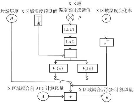 如圖9所示,X區(qū)域?qū)崟r(shí)反饋溫度經(jīng)過低切保護(hù)模塊LCUT和濾波模塊LAG后,與預(yù)設(shè)值M進(jìn)行比較,計(jì)算的差值進(jìn)入溫度-風(fēng)量折算函數(shù)F(x)。同時(shí)根據(jù)溫度上升和下降的速度變化率K,對函數(shù)的輸出速率進(jìn)行擾動(dòng),改變其響應(yīng)速度。首先X區(qū)域的理論計(jì)算風(fēng)量是耦合前原有ACC系統(tǒng)通過垃圾熱值、垃圾占比、鍋爐蒸發(fā)量、氧氣含量、鍋爐焓值等一系列參數(shù)計(jì)算出來的爐排下一次風(fēng)支管風(fēng)量,是實(shí)時(shí)變化的動(dòng)態(tài)數(shù)值,而X區(qū)域的溫度預(yù)設(shè)值M與反饋值P的差值反映的是X區(qū)域內(nèi)垃圾焚燒過于劇烈,還是處于未完全燃燒狀態(tài)。因?yàn)槔贌^程的復(fù)雜性,可以做出以下關(guān)系函數(shù):一方面在爐內(nèi)垃圾層厚度等于或大于理論的標(biāo)準(zhǔn)厚度前提下,當(dāng)X區(qū)域溫度M大于P則風(fēng)量減少,當(dāng)X區(qū)域溫度M小于P則風(fēng)量增加,當(dāng)X區(qū)域溫度M等于P則保持原有ACC計(jì)算風(fēng)量不變,此時(shí)選擇公式F1(x)內(nèi)部函數(shù);另一方面在爐內(nèi)垃圾層厚度小于標(biāo)準(zhǔn)厚度前提下,此時(shí)判斷料層過薄,風(fēng)量太大容易出現(xiàn)燒空、燒斷料的情況,因此當(dāng)M與P的差值為正數(shù)或負(fù)數(shù)時(shí)都會(huì)適當(dāng)減少風(fēng)量,但根據(jù)溫度的高或低對應(yīng)減少風(fēng)量的幅度會(huì)不同,此時(shí)利用F2(x)內(nèi)部函數(shù)。12個(gè)溫度劃分區(qū)域都基于此耦合邏輯,具體設(shè)定參數(shù)適時(shí)調(diào)整。通過干擾獨(dú)立配風(fēng)的風(fēng)量,達(dá)到改變整個(gè)焚燒爐一次風(fēng)風(fēng)量的效果。- 判斷標(biāo)準(zhǔn)及運(yùn)行效果