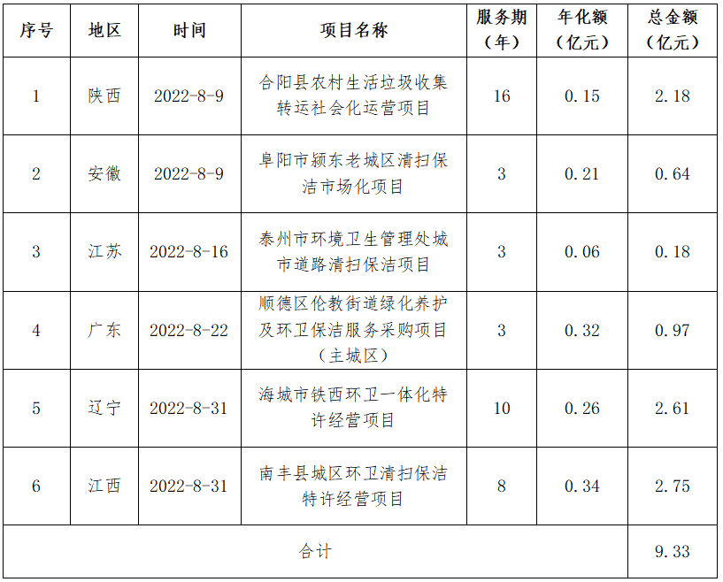 其中最典型的就是山東省德州市寧津縣城鄉(xiāng)環(huán)衛(wèi)一體化及綠化提升項目,該項目服務(wù)期為20年,第一至第二年合同額預(yù)估為5682萬元,第三至二十年合同額預(yù)估為13.4514億元,合計金額14.0196億元。項目服務(wù)范圍包括但不限于寧津縣10座鄉(xiāng)鎮(zhèn)垃圾轉(zhuǎn)運站的升級改造以及新建鄉(xiāng)鎮(zhèn)生活垃圾分類處理項目,鄉(xiāng)鎮(zhèn)駐地及國省干道綠化提升工程以及縣城綠化提升工程(包括福寧河公園提升改造、道路綠化及小游園提升改造、康寧湖提升改造工程)及其他環(huán)衛(wèi)服務(wù)。據(jù)環(huán)衛(wèi)科技網(wǎng)粗略統(tǒng)計,北控城市環(huán)境今年已中標(biāo)近20個環(huán)衛(wèi)項目,合計中標(biāo)金額超過48億元。在年度排行榜上,目前僅次于盈峰環(huán)境和僑銀股份,排在第三的位置。進(jìn)入2022年,盈峰環(huán)境和僑銀股份兩家環(huán)衛(wèi)龍頭企業(yè)延續(xù)了以往的強(qiáng)勢,幾乎每個月度排行都榜上有名。8月,盈峰環(huán)境和僑銀股份再次上榜,分別排在第5和第7的位置。盈峰環(huán)境當(dāng)月中標(biāo)6個環(huán)衛(wèi)項目,尤其在最后一天同時拿下遼寧省海城市鐵西環(huán)衛(wèi)一體化和江西省南豐縣城區(qū)環(huán)衛(wèi)清掃保潔兩個特許經(jīng)營項目,南北“雙響”收獲5.36億元。表3 盈峰環(huán)境8月中標(biāo)項目匯總