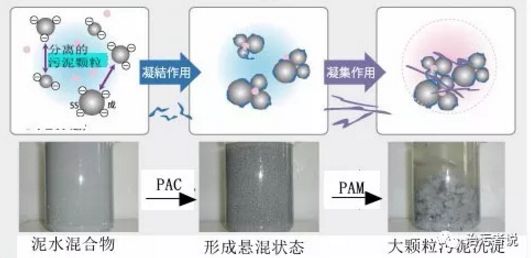 那么什么樣的化學(xué)藥劑可以作用到污泥中這些因素,并能夠?qū)崿F(xiàn)污泥中水分的去除呢?我們來了解一種化學(xué)藥劑,學(xué)名為聚丙烯酰胺,化學(xué)名稱的縮寫為PAM。PAM作為一種聚合藥劑,在水處理中的應(yīng)用廣泛,主要是對泥水混合物進(jìn)行有效的固液分離,從而實(shí)現(xiàn)污泥脫水的化學(xué)凝聚作用。對于PAM的制作和特性,在很多文獻(xiàn)中都有,不作為今天主要討論的內(nèi)容。今天就是來看PAM是怎樣實(shí)現(xiàn)對泥水混合物的固液分離的,我們來看看這一張圖。