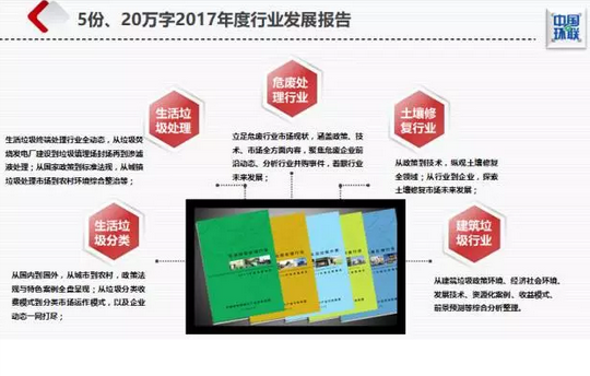 生活垃圾處理行業(yè)2017年度發(fā)展報告:該報告囊括生活垃圾終端處理行業(yè)動態(tài),從垃圾焚燒發(fā)電廠到垃圾填埋場封場處理;從國家政策到標(biāo)準(zhǔn)法規(guī),從城鎮(zhèn)垃圾處理市場到農(nóng)村環(huán)境綜合整治等;