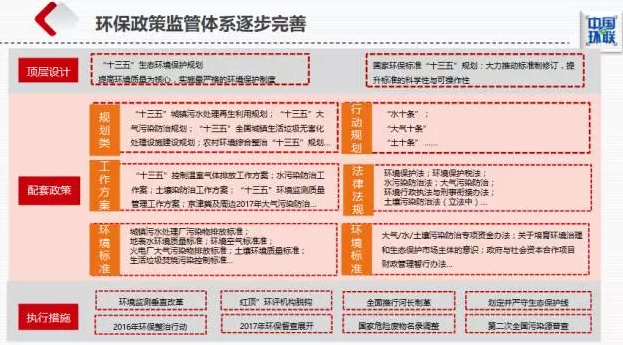 2017年以來,環(huán)保監(jiān)管體系重構(gòu):從頂層政策,如“十三五”生態(tài)環(huán)境保護規(guī)劃,到水、氣、固、土壤的配套政策,再到環(huán)保垂改、專項整治等具體措施,三位一體重構(gòu)環(huán)保政策監(jiān)管體系,強調(diào)治理效果,提升監(jiān)管力度。在責(zé)任主體、監(jiān)管體系、排污收費、排污許可、排污權(quán)交易等五個方面進(jìn)行重大改革,從多個方面吸引社會力量共同改善環(huán)境質(zhì)量,把過去被動化、模糊化的管理變?yōu)榱酥鲃踊?、定量化、清晰化的管理?/p>