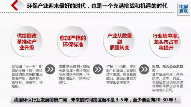 供給側(cè)改革是我國“十三五”時期的發(fā)展主線,而環(huán)保是推進(jìn)供給側(cè)改革的重要手段。十九大進(jìn)一步明確了“綠水青山就是金山銀山”的戰(zhàn)略思想,我國的環(huán)保產(chǎn)業(yè)發(fā)展正迎來最好的時代,環(huán)保標(biāo)準(zhǔn)將越來越高,環(huán)境治理邁入“效果化”時代,環(huán)保產(chǎn)業(yè)將經(jīng)歷從數(shù)量到質(zhì)量的變化。與此同時,并購持續(xù),行業(yè)集中度提升,擁有較強技術(shù)集成能力、綜合管理能力、建設(shè)運營能力的龍頭企業(yè)市場占有率將穩(wěn)步提升。我國環(huán)保行業(yè)發(fā)展前景廣闊,未來的時間跨度絕不是 3-5 年,至少要面向20-30 年。