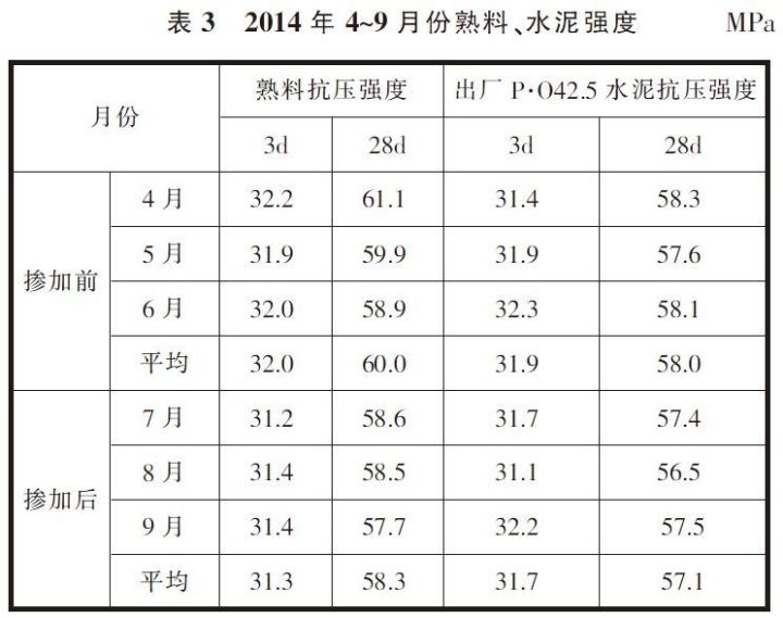 從表3可看出,使用污染土壤之后熟料3d、28d平均抗壓強度分別較使用前下降2.2%和2.8%;同樣出廠水泥強度也有所下降,9月份由于調整了水泥配比使水泥強度有所恢復。