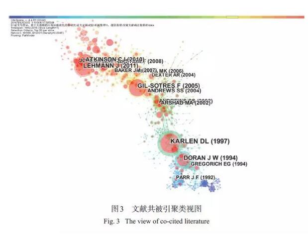 以1 a 為時間切片,節(jié)點類型為參考文獻,選取Top 50 (被引量前50 篇文章) 繪制文獻共被引圖譜。引文年輪代表著某篇文章的引文歷史,年輪顏色代表相應的引文時間,年輪厚度與相應時間分區(qū)內的引文數(shù)量成正比。中心度較高的文獻可能成為網(wǎng)絡中由一個時間段向另一個時間段過渡的關鍵點,具有一定程度的理論創(chuàng)新。突現(xiàn)性較高的文獻是指在某一階段被引次數(shù)迅速上升的文獻,這類文獻可能會成為后來的中心文獻和研究熱點。本研究共探測出中心性在0.01 以上的文獻共204 篇,為突出關鍵文獻,截取中心性在0.03 以上的關鍵文獻共44 篇。所選取的這44 篇高中心性文獻的被引頻次和突現(xiàn)性均較大,它們是土壤質量研究文獻群中起到關鍵作用或具有轉折意義的文獻,是不同時期的基礎性、奠基性經(jīng)典文獻,對該領域學術發(fā)展發(fā)揮著重要作用。圖3 中,共被引頻次較高、中心度較大的節(jié)點年輪較大,是引發(fā)大量學者關注或發(fā)生研究轉向的文獻(為避免文獻較多而造成的文字疊加,本圖僅列出共被引量大于17 的文獻)。圖中紅色年輪代表突現(xiàn)性較大的關鍵文獻,由藍色區(qū)域到紅色區(qū)域分別代表了1992—2016 年的研究時段。