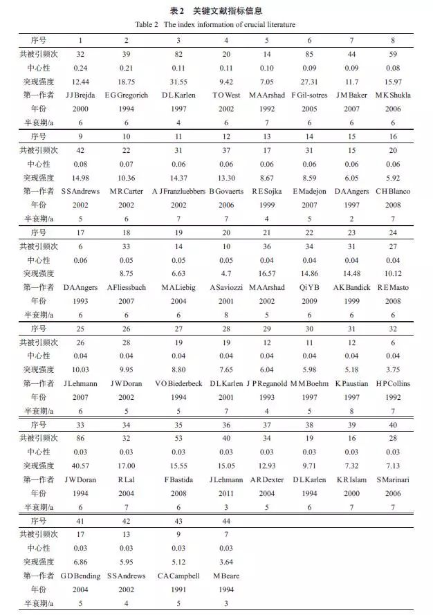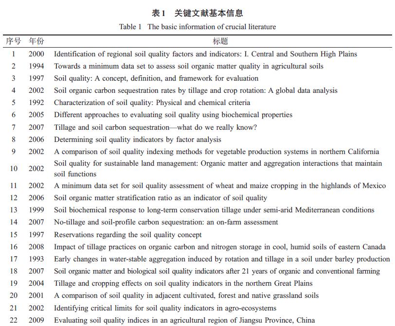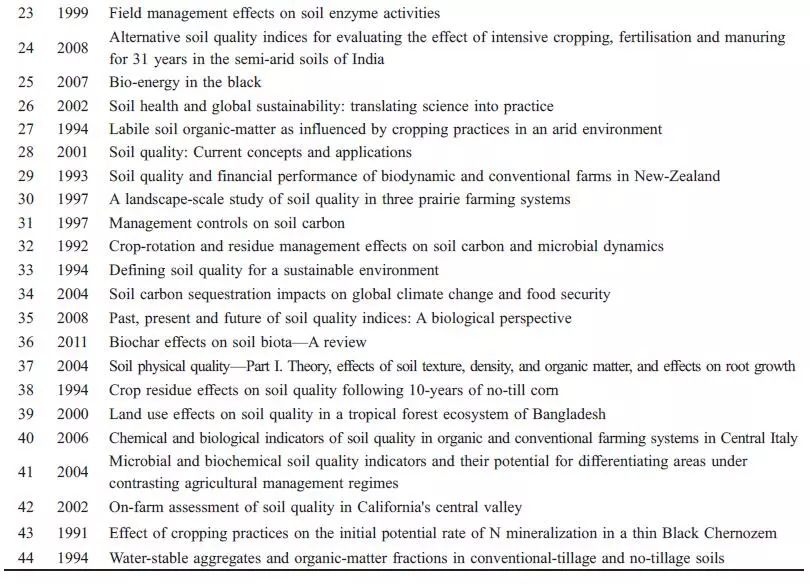 經(jīng)典文獻都密切關注了文獻發(fā)表時期該領域發(fā)展的熱點問題,因其較高的社會關注度、創(chuàng)新性和系統(tǒng)性,從而引發(fā)其他學者大量引用。通過對44 篇經(jīng)典文獻內容的分析,2000 年以前多關注農(nóng)業(yè)管理措施對有機質的影響和土壤質量的概念,2000 年以后,對土壤質量評價方法、評價指標尤其是生物學指標的研究不斷興起,更多地注重土壤質量在農(nóng)業(yè)和環(huán)境方面的應用,2008 年以來,關于土壤質量與全球氣候變化、土壤修復的關系研究受到更多學者關注。從整個過程來看,土壤質量從概念的產(chǎn)生到廣泛的應用,一直圍繞農(nóng)業(yè)與環(huán)境的可持續(xù)發(fā)展,這也是人類可持續(xù)發(fā)展的主題之一。