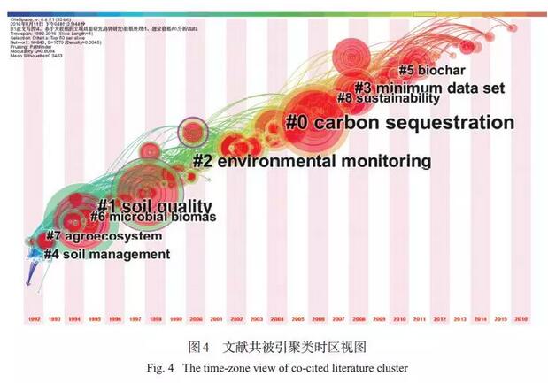 本研究中所認為的“研究主題”是指在一定時段內,眾多學者探討和解決的中心問題,Citespace V通過對文獻共被引的分析,將研究內容相似的文獻進行歸類并命名。通過對5 551 篇文獻進行共被引分析,共獲取28 個聚類,如果聚類中文獻數(shù)量較少,則會影響其命名的準確性,因此本研究選取文獻數(shù)量在30 篇以上的8 個聚類進一步分析,聚類的時間分布和命名見圖 4。通過圖4 可以發(fā)現(xiàn),研究早期(2000 年以前) 主題較為分散,主要集中在土壤管理(#4)、農(nóng)業(yè)生態(tài)系統(tǒng)(#7)、微生物生物量(#6)、土壤質量概念(#1) 等方面,2000 年以來,環(huán)境監(jiān)測(#2)、碳匯(#0) 研究最多,另外近幾年焦點聚集在可持續(xù)性(#8)、最小數(shù)據(jù)集(#3)、生物炭(#5) 上。