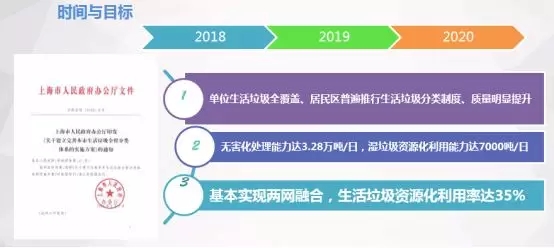 今年4月份,上海發(fā)布《上海市生活垃圾全程分類體系建設行動計劃(2018-2020年)》(下稱《行動計劃》),根據(jù)《行動計劃》,到2020年底,基本實現(xiàn)單位生活垃圾強制分類全覆蓋,居民區(qū)普遍推行生活垃圾分類制度,生活垃圾分類質(zhì)量明顯提升。生活垃圾綜合處理能力達到3.28萬噸/日以上,其中,濕垃圾資源化利用能力達到7000噸/日,基本實現(xiàn)兩網(wǎng)融合,生活垃圾資源回收利用率達到35%以上。