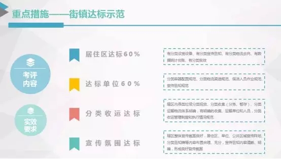 根據(jù)《上海市生活垃圾分類達標、示范街道(鎮(zhèn)、鄉(xiāng))考評辦法(試行)》,要成為生活垃圾分類達標街鎮(zhèn),其轄區(qū)內(nèi)60%的居住區(qū)和單位先要達標,轄區(qū)內(nèi)各類垃圾的分類投放、收集(分揀、暫存)、運輸物流體系明確,還要建立垃圾分類領導和協(xié)調(diào)機制,落實居住區(qū)垃圾分類居委、物業(yè)、業(yè)主、第三方的責任人和所負責任。成為生活垃圾分類示范街鎮(zhèn)的門檻更高,轄區(qū)內(nèi)80%的居住區(qū)和單位生活垃圾分類實效要達標。