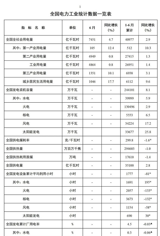 國家能源局發(fā)布1-6月份全國電力工業(yè)統(tǒng)計(jì)數(shù)據(jù):光伏發(fā)電裝機(jī)340GW,投資631億元