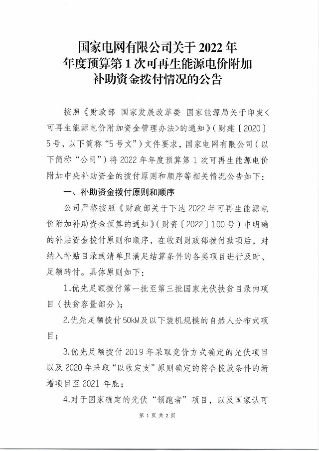 2022年7月15日,國家電網(wǎng)微信平臺(tái)發(fā)布“關(guān)于2022年年度預(yù)算第1次可再生能源電價(jià)附加補(bǔ)助資金撥付情況的公告”,提到將對納入補(bǔ)貼或清單且滿足結(jié)算條件的各類項(xiàng)目進(jìn)行及時(shí)、足額轉(zhuǎn)付。 具體來看,2022年年度預(yù)算第1次請款,財(cái)政部共預(yù)計(jì)撥付國家電網(wǎng)可再生能源電價(jià)附加補(bǔ)助資金年...