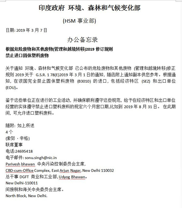 3月13日,本網(wǎng)報(bào)道了《印度宣布將全面禁止進(jìn)口固體塑料廢物》?!敖沼《拳h(huán)境、森林和氣候變化部發(fā)布一份官方聲明,稱印度政府已發(fā)布禁令,禁止印度(包括經(jīng)濟(jì)特區(qū)和出口型企業(yè))進(jìn)口固體塑料廢棄物。不過該聲明尚未透露這一禁令何時(shí)正式生效?!庇《日?環(huán)境、森林和氣候變化部(HSM事業(yè)部)日期:2019年3月...