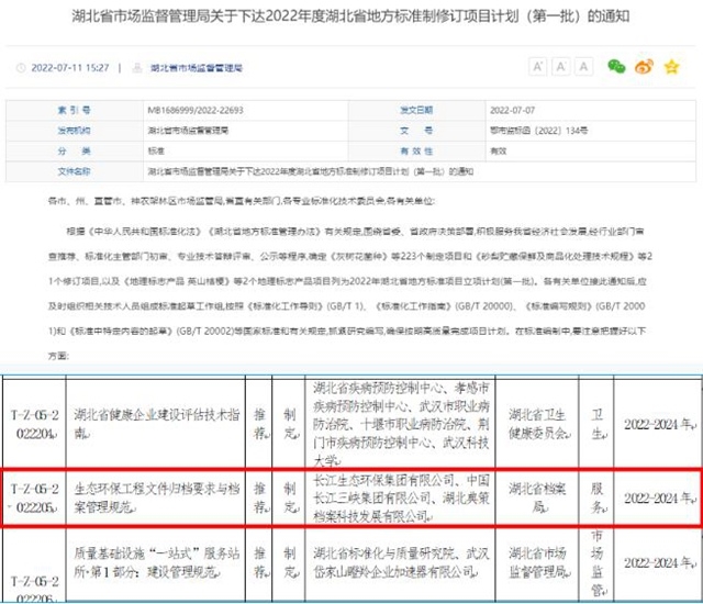 近日,湖北省市場(chǎng)監(jiān)督管理局印發(fā)關(guān)于下達(dá)2022年度湖北省地方標(biāo)準(zhǔn)制修訂項(xiàng)目計(jì)劃(第一批)的通知,長(zhǎng)江環(huán)保集團(tuán)牽頭主編的《生態(tài)環(huán)保工程文件歸檔要求與檔案管理規(guī)范》成功入選2022年湖北省地方標(biāo)準(zhǔn)項(xiàng)目立項(xiàng)計(jì)劃(第一批),這是公司成立以來(lái)首次牽頭主編的省級(jí)地方標(biāo)準(zhǔn)?!逗笔∈袌?chǎng)監(jiān)督管理局關(guān)于下達(dá)2022年...