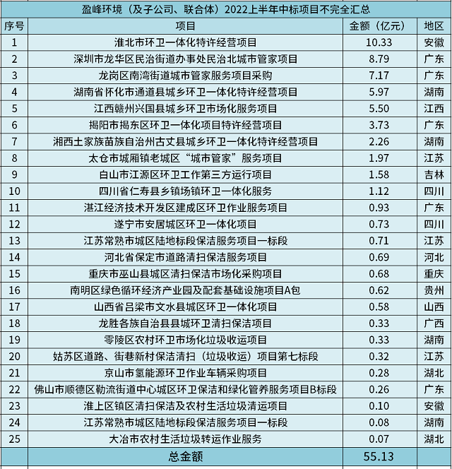 2022年上半年,國(guó)內(nèi)環(huán)衛(wèi)市場(chǎng)依舊風(fēng)云變幻。既頻頻掉落10億級(jí)項(xiàng)目,又有環(huán)衛(wèi)與物業(yè)的新老玩家之爭(zhēng),更有40進(jìn)1、16進(jìn)1、10進(jìn)1等“奪標(biāo)戰(zhàn)”引關(guān)注。而就在激烈的交鋒中,盈峰環(huán)境作為作為頭部環(huán)衛(wèi)企業(yè)之一,亦有著搶眼表現(xiàn)。 據(jù)環(huán)保在線不完全統(tǒng)計(jì),截至6月底,盈峰環(huán)境中標(biāo)二十余個(gè)...
