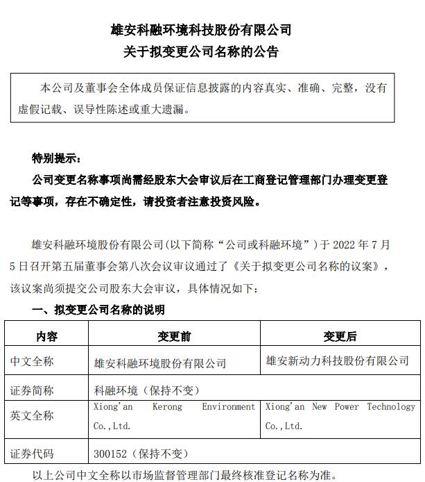 2022年7月5日,雄安科融環(huán)境科技股份有限公司發(fā)布《關(guān)于擬變更公司名稱的公告》。 科融環(huán)境擬更名為“雄安新動(dòng)力科技股份有限公司”,證券簡(jiǎn)稱不變,證券代碼不變。(公司中文全稱以市場(chǎng)監(jiān)督管理部門最終核準(zhǔn)登記名稱為準(zhǔn)) 科融環(huán)境表示,更名原因在于公司自2010年IPO以來(lái),業(yè)務(wù)從...
